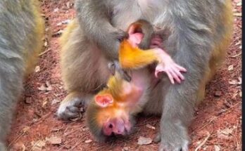 A first-time mother monkey nervously clutches her fragile newborn, her small hands trembling as she tries to keep it close. Every movement is cautious, yet uncertain—she dips, lifts, and adjusts, …