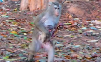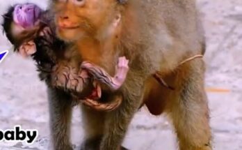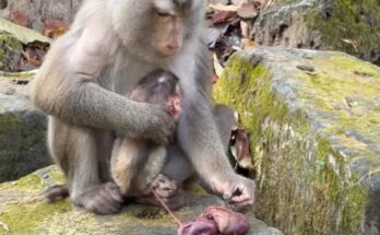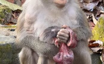 A young long-tailed monkey experienced a beautiful and unforgettable moment today as she welcomed her very first baby into the world. The tiny newborn clung gently to its mother, its …