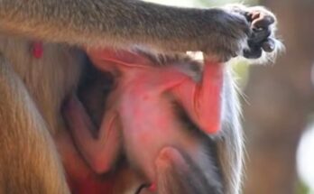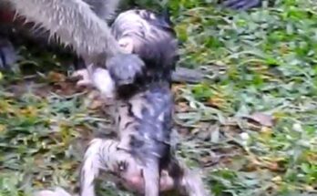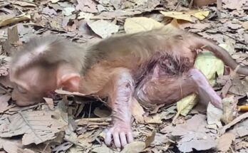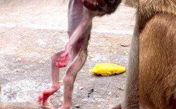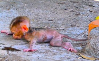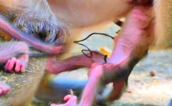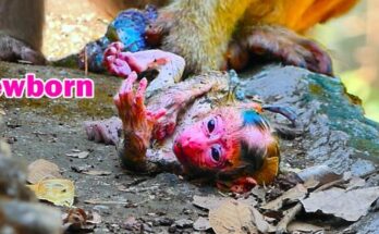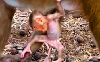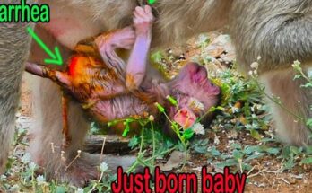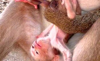 A tiny baby monkey clings tightly to his mother, his small body trembling with uncertainty. Though she holds him close, the position feels unfamiliar, leaving him uneasy and searching for …