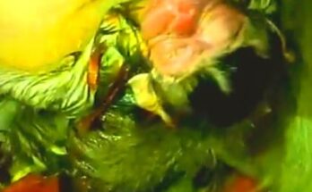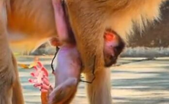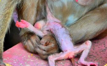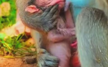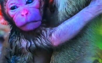 An old mother monkey gently holds her newborn close, wrapping the tiny infant in her arms with steady warmth. Her tired eyes soften as she leans in, offering comfort and …
