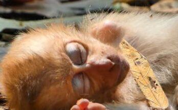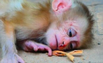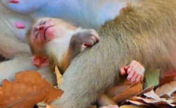 In the quiet corner of the forest, a heartbreaking scene unfolds. A tiny baby monkey sits alone on a branch, his eyes half-closed, body trembling slightly with exhaustion. Just moments …
