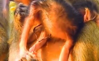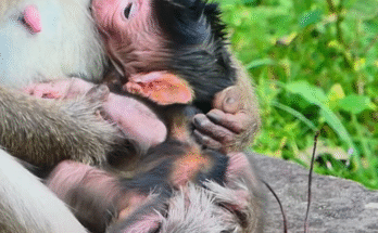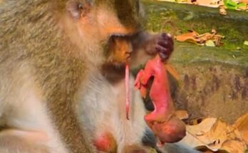 A gentle tension fills the jungle as a young mother monkey sits cautiously beside her newborn, her eyes full of curiosity and uncertainty. This is her first baby, and everything …