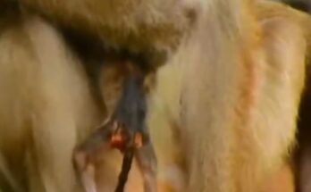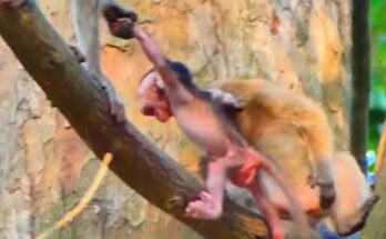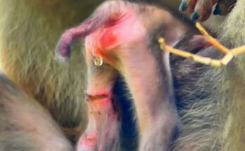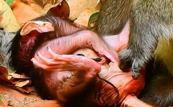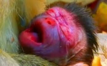 Only one hour old, the tiny newborn monkey rests quietly against its mother, wrapped in warmth and safety. After the exhausting moment of birth, the mother sits calmly, gently adjusting …