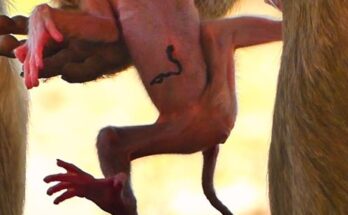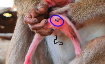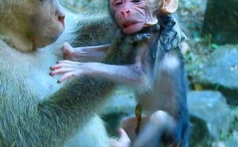 A fragile newborn baby monkey clings softly to life, its tiny body trembling with weakness. Its eyes barely open, searching for comfort and warmth from its exhausted mother. She tries …