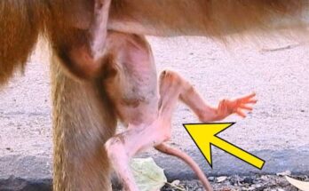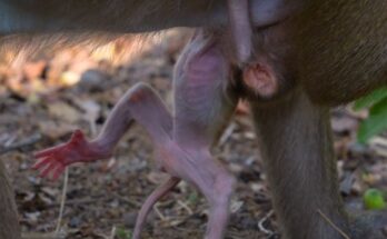 A small, weak steely monkey sits quietly, its tiny body trembling with exhaustion. Soft cries escape its lips as it searches for the warmth of its mother. Its eyes, filled …