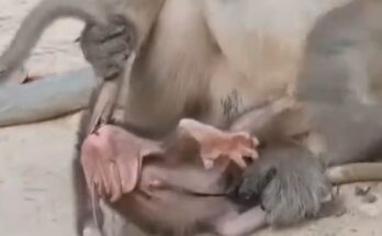 In a calm and quiet moment, a devoted mother monkey gently examines her baby, her eyes filled with care and quiet concern. She carefully checks its tiny body, brushing through …