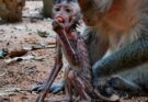 In the quiet of the forest, an older mother monkey welcomes new life with patience earned over years. As the newborn arrives, it slips briefly, a small, natural misstep in …