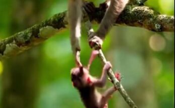 High above the forest floor, a heartbreaking moment unfolds as a tiny newborn monkey loses its grip and falls from the top tree. The world seems too large for such …