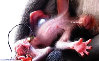 A loving mother monkey cradles her fragile baby against her chest, feeling each faint breath as time quietly slips away. She gently strokes the tiny head, whispering soft, comforting sounds only a mother knows. Her eyes are heavy with sorrow, yet full of endless love, refusing to let go too soon. The baby clings weakly, finding warmth and safety in her embrace one last time. Around them, the world continues, unaware of this silent heartbreak. She holds tighter, memorizing every moment, every touch. In that tender silence, her love speaks louder than words, carrying her baby peacefully into goodbye.