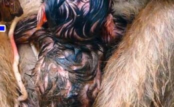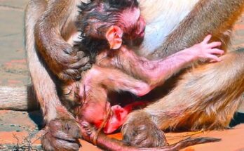 In a quiet corner of the forest, a heartbreaking scene unfolds as a devoted mother monkey struggles to feed her newborn, Baby Bacca. She cradles him gently against her chest, her eyes filled with worry and confusion. Despite her constant efforts, she cannot produce enough milk to satisfy his tiny hunger. Baby Bacca clings tightly to her, searching for comfort and nourishment, his soft cries echoing through the trees. The mother’s love is undeniable, shown in every tender touch and protective embrace. Though weak and anxious, she refuses to give up, hoping strength and help will soon come for her precious little one.