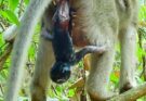 On a quiet, cool morning, a devoted mama monkey cradles her tiny newborn close to her chest. The soft mist lingers in the air as she gently wraps her arms around the fragile baby, sharing her warmth and comfort. Her eyes remain watchful yet calm, filled with instinctive love and care. The newborn, still adjusting to the world, clings softly to her fur, finding safety in her embrace. Every small movement from the mother is tender and deliberate, ensuring her baby feels secure and protected. The chill of the morning fades in the presence of her warmth, creating a peaceful moment between them. This simple yet powerful bond shows the depth of a mother’s love in nature—quiet, patient, and unwavering. In her gentle hug, the newborn finds not only heat but also a sense of belonging and life’s very first feeling of safety.