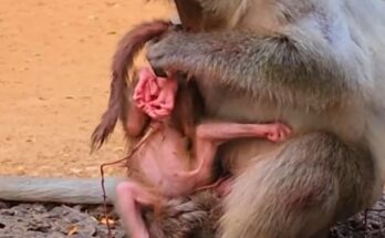 A tiny baby monkey clings to his mother, softly pleading for milk with weak cries and hopeful eyes. His small hands reach for comfort, but the mother monkey gently pushes him away, perhaps feeling tired or unsure. The fragile infant does not understand why he is refused and continues to seek warmth and nourishment. He crawls closer again, determined and innocent, believing his mother will accept him. The mother watches quietly, showing a mix of hesitation and care. In this touching moment of struggle, the little monkey’s persistence reflects pure trust, while the mother slowly considers her instinct to protect and nurture her vulnerable baby.