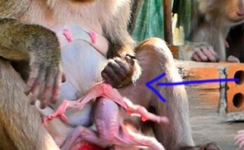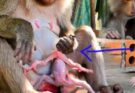 A weak newborn monkey stays pressed against her mother’s chest, holding on with tiny trembling fingers. Her small body looks fragile, and every movement seems to take great effort. Instead of exploring like other young monkeys, she chooses to remain close, clinging tightly for warmth and comfort. Her mother moves carefully through the trees, adjusting her steps to keep her baby secure and safe from harm.