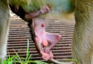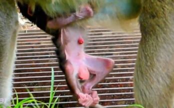 A young monkey sits quietly, confusion and concern written across her gentle eyes as she tries to care for her newborn. Instinct guides her, but experience is still learning to follow. She shifts the tiny baby from one arm to the other, unsure how to hold it safely or keep it warm. At times, her grip is awkward, yet her love is unmistakable. She watches other mothers closely, slowly learning through observation and trial. Despite her struggles, she never gives up. Each careful movement shows growing determination, as maternal instinct strengthens with every moment spent protecting her fragile baby.
