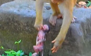 In the quiet heart of the forest, a gentle moment unfolds as the mother monkey welcomes her tiny newborn into the world. Her body still trembles from the effort of birth, yet her eyes shine with a deep, unspoken love. Carefully, she gathers her fragile baby into her arms, holding it close to her warm chest. The little one, still wet and weak, clings instinctively to its mother’s fur, seeking the comfort and safety only she can provide.