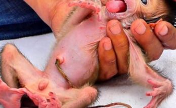 A young mother monkey lies quietly, her body weak and trembling after the long, painful birth. Her eyes look heavy with exhaustion, yet they soften with love as she gazes at her tiny, sweet baby. The newborn clings gently to her chest, seeking warmth and comfort. Though tired, she carefully wraps her arms around the fragile little one, protecting it from the world. Every breath she takes feels slow, but her heart is full of care. In this quiet moment, her strength fades, yet her motherly love shines brighter than her fatigue, guiding her to nurture her precious baby.