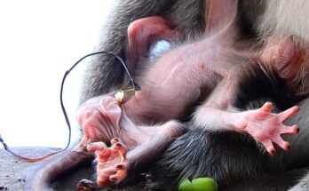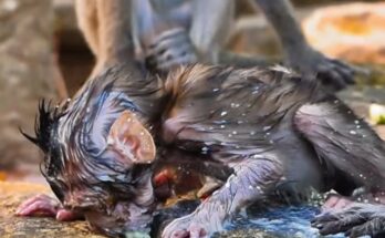 Little monkey cries for help after getting head stuck tightly inside hollow tree trunk. The forest becomes quiet as its distressed calls echo between the trees. The young monkey had been exploring out of curiosity when it squeezed into a narrow opening and became trapped. Unable to free itself, it panics and calls out repeatedly, hoping its mother or herd will hear. Nearby animals grow alert to the unusual sounds. The situation highlights how curiosity can sometimes lead to danger in the wild. With time, the group may come together to carefully assist and guide frightened little monkey to safety.